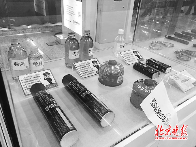 活動現(xiàn)場,主辦方還用櫥窗展示了近期收繳的各類禁限帶物品,其中有繳獲的爆炸類物品、仿真槍、管制類刀具、軍警用品等。2017上半年北京地鐵安檢共計檢查物品6.2億件,查獲各類違禁品與限帶品6.9萬件,其中軍警用具類330件,刀具類2.7萬件,易燃易爆品4.2萬件。地鐵安檢在將違禁品和危險品查堵于站外的同時,也對違法犯罪分子起到了震懾作用。